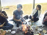 こちらオプションの無いさみしい光景です。(僕はこちらでした)左端の赤い服を来たU君は小豆島ツーリング中に希少なスモールフララップで転倒→ほぼ全損!と言うツワモノ。広島チームの中では1番良く食べます。彼のおかげで焼肉が残る事はありません(笑)その横のKさんは日本に3台しか無いと言われているACMAのTAPを持っている凄い人!但し、僕が2年もエンジンを預かっている為(OH依頼)現在はオブジェ化しています。ゴメンなさい・・・ |