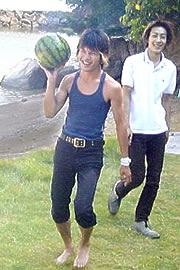 スイカ割用のスイカを持って大喜び?のT君。TV200のオーナーです。右横のA君はSX200のオーナー! |